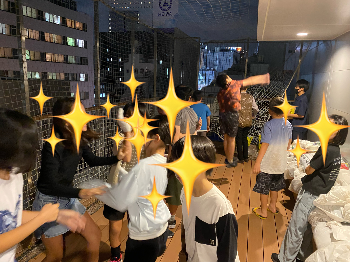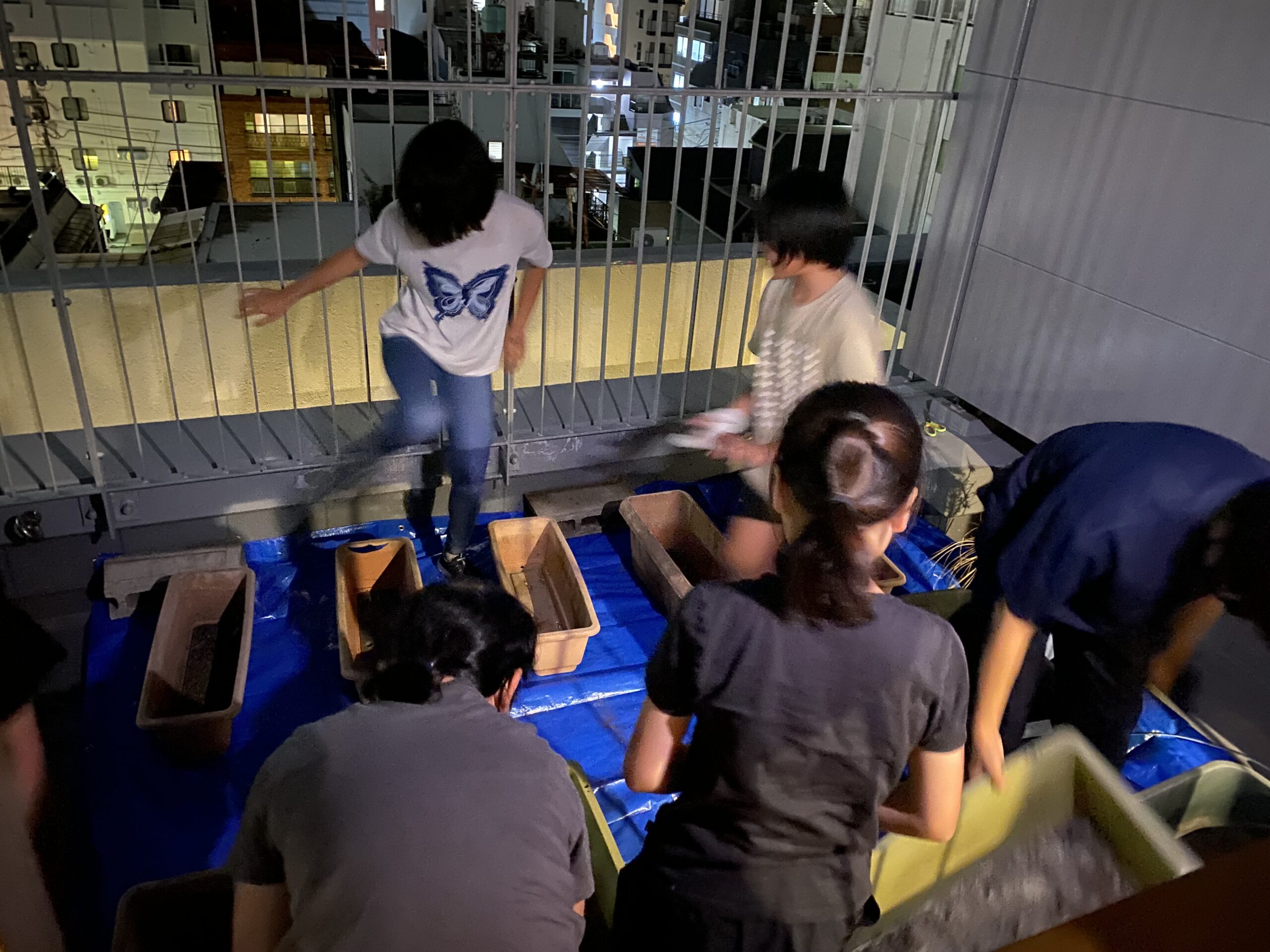 まずは屋上のスペースにビニールシートを敷いて、プランターを置く準備をしました。