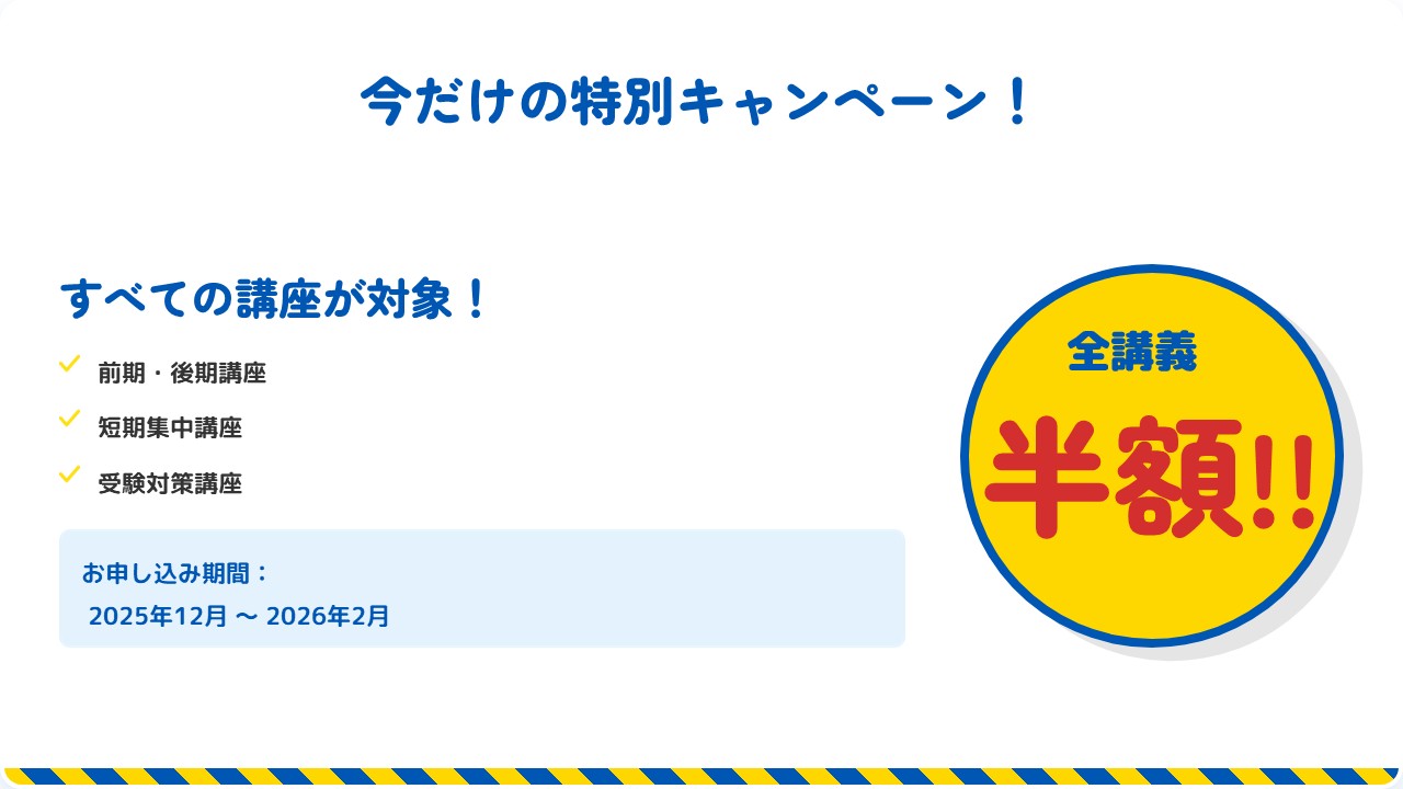 2月までのお申し込みの場合、すべての講義が半額になります。