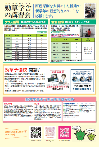 間もなく2月を迎える時期ですが、春期講習会のお知らせです。 学年最後の復習・まとめと新学年の準備という両側面で重要な講習会です。